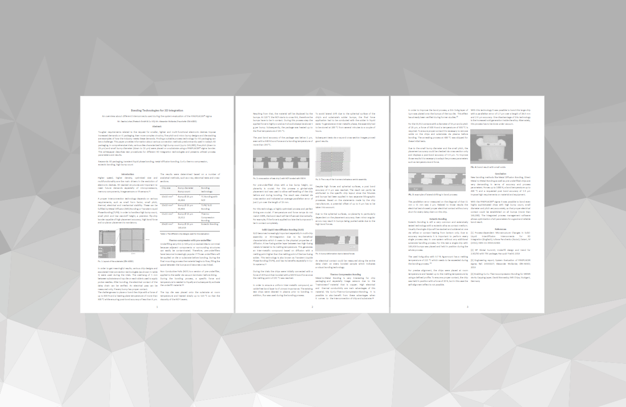Abstract: Tougher requirements related to the request for smaller, lighter and multi-functional electronic devices impose increased demands on IC packaging. Ever more complex circuitry, fine pitch and micro bump designs and die stacking are examples of how the industry meets these demands. Finding a suitable process technology for 3D packaging can be a challenge. This paper provides information about various connection methods predominantly used in today's 3D packaging. In comprehensive trials, various dies characterized by high bump count (up to 143,000), fine pitch (down to 25 μm) and small bump diameter (down to 13 μm) were placed on a substrate using a FINEPLACER® sigma bonder. This whitepaper describes test procedures for different 3D integration technologies and presents utilized process parameters and results.