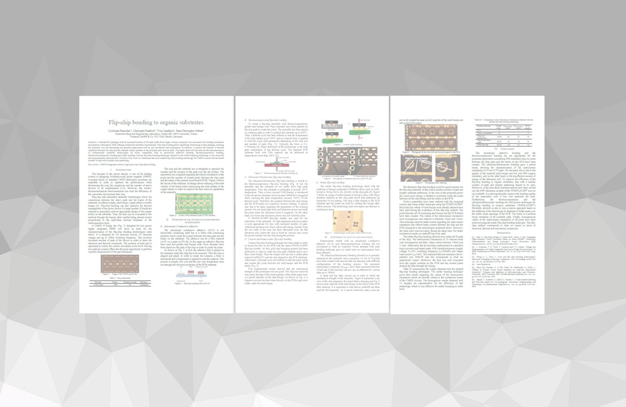 Standard IC packages with an increased number of I/O pads suffer from larger volume, increased cost, increased wire bonding resistances and parasitic inductances while offering normalized assembly requirements. Flip-chip bonding allow significant downsizing of chip package, reducing the assembly cost and decreasing the parasitic phenomena such as pad resistances and inductances. In addition, it reduces the number of thermal interfaces between the chip and the substrate which operates as the principal heat removal path. This paper deals with the tests for the characterization of commercially available technologies for micro assemblies such as anisotropic adhesive bonding, thermocompression bonding, thermosonic/ultrasonic bonding and solder bonding. Custom flip-chip bonding technique inspired by the solder bumping technology is also proposed and experimentally characterized. The aim of this work is to determine the most suitable flip-chip bonding technology for CMOS circuits with increased number of pads and complex land patterning.
