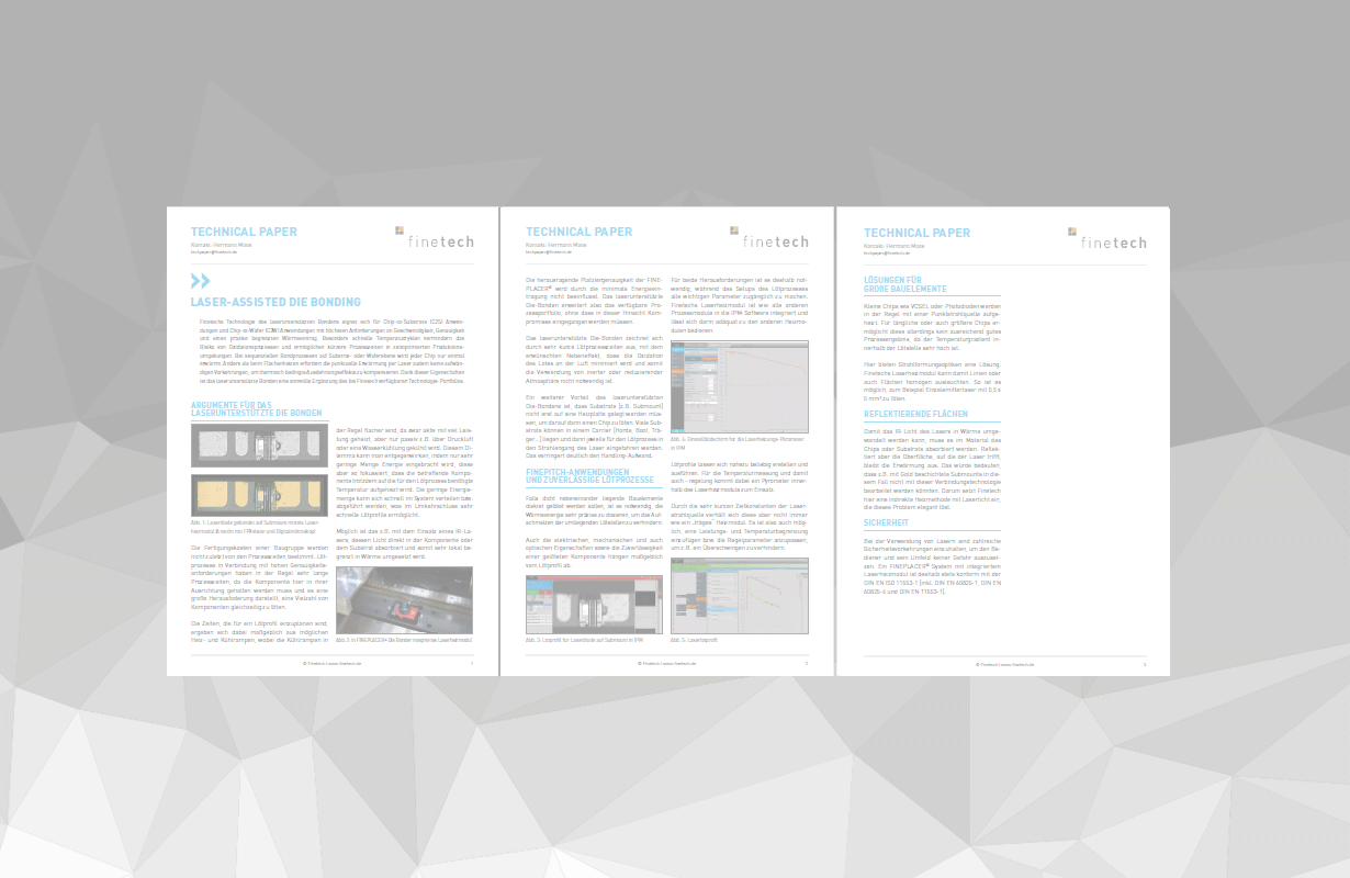 Abstract: Finetech’s laser-assisted die bonding technology is suitable for C2S and C2W applications with highest requirements regarding process speed, accuracy and precisely controlled local heat input even to smallest areas. Particularly quick temperature cycles minimize the risk of surface oxidation and allow shorter process cycles in time-optimized production environments. During sequential substrate-level or wafer-level bonding processes, each chip will be heated up only once. As opposed to area heating, localized laser heating does not require extensive provisions to avoid thermal expansion. Chips can be bonded with an edge-to-edge clearance of only 500 micron, with adjacent solder dots being reliably protected from (re-)melting.
