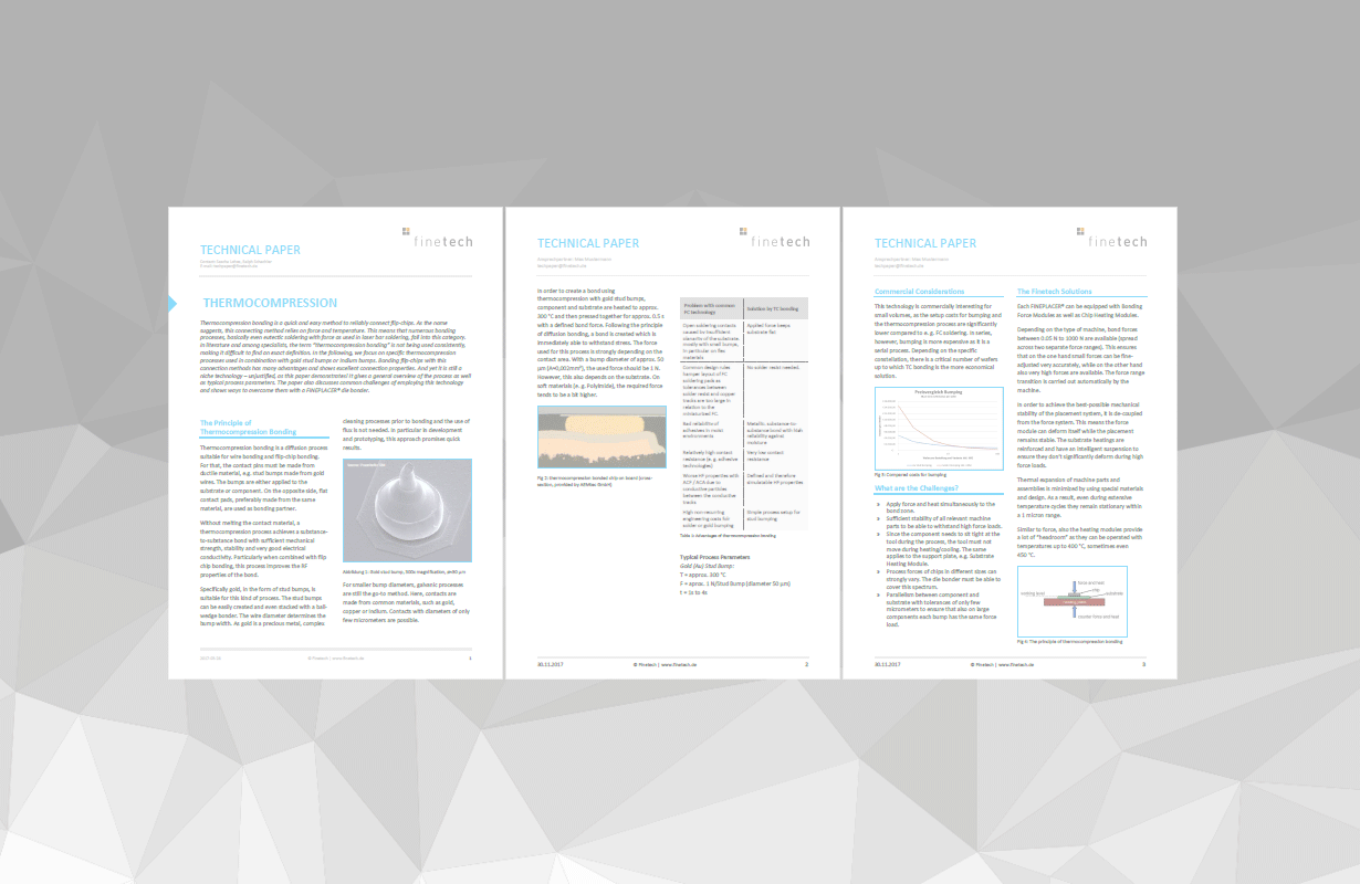 Abstract: Thermocompression bonding is a quick and easy method to reliably connect flip-chips. As the name suggests, this connecting method relies on force and temperature. This means that numerous bonding processes, basically even eutectic soldering with force as used in laser bar soldering, fall into this category. In literature and among specialists, the term “thermocompression bonding” is not being used consistently, making it difficult to find an exact definition. In the following, we focus on specific thermocompression processes used in combination with gold stud bumps or Indium bumps. Bonding flip-chips with this connection methods has many advantages and shows excellent connection properties. And yet it is still a niche technology – unjustified, as this paper demonstrates! It gives a general overview of the process as well as typical process parameters. The paper also discusses common challenges of employing this technology and shows ways to overcome them with a FINEPLACER® die bonder.