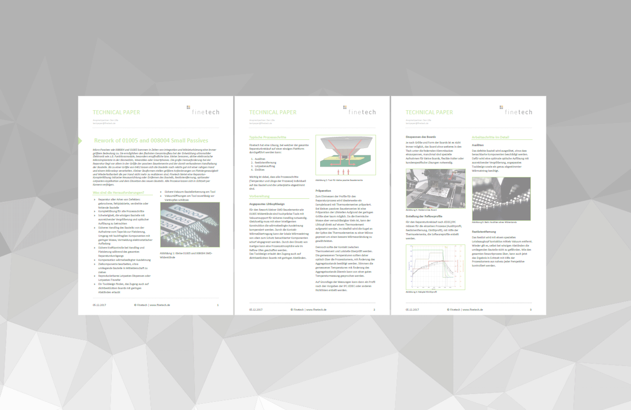 Abstract: 008004 and 01005 small passive components are becoming more and more important these days (integration, miniaturization etc.). They allow particularly flat package designs when developing ultra-mobile electronic products such as functional modules, very small or sensitive sensors, active electronic micro implants for biomedical applications, wearables or smartphones. The major challenge in this type of rework is the size of the passive components and their respective handling. Components with the size of 0402 can be still relatively well processed with a steady hand and a microscope. Smaller components set higher requirements for placement accuracy and reproducibility which cannot be achieved by hand. Finetech offers a complete solution including component re-alignment or removal, site cleaning and optional paste application and replacement with the industries best optical resolution – incorporating real-time inspection during the process.
