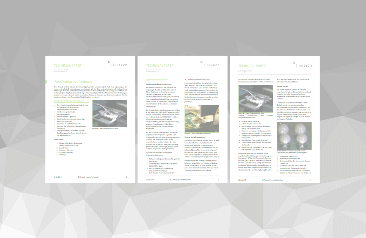 Abstract: Rework of SMD components frequently requires the application of fresh solder paste onto the PCB pads. Industry standard is screen and stencil printing, however, due to restricted space on densely populated PCBs, this is not always a viable approach. Possible methods and solutions always have to be individually adapted to the existing conditions. Finetech offers a variety of equipment solutions for suitable solder paste application during the rework cycle.