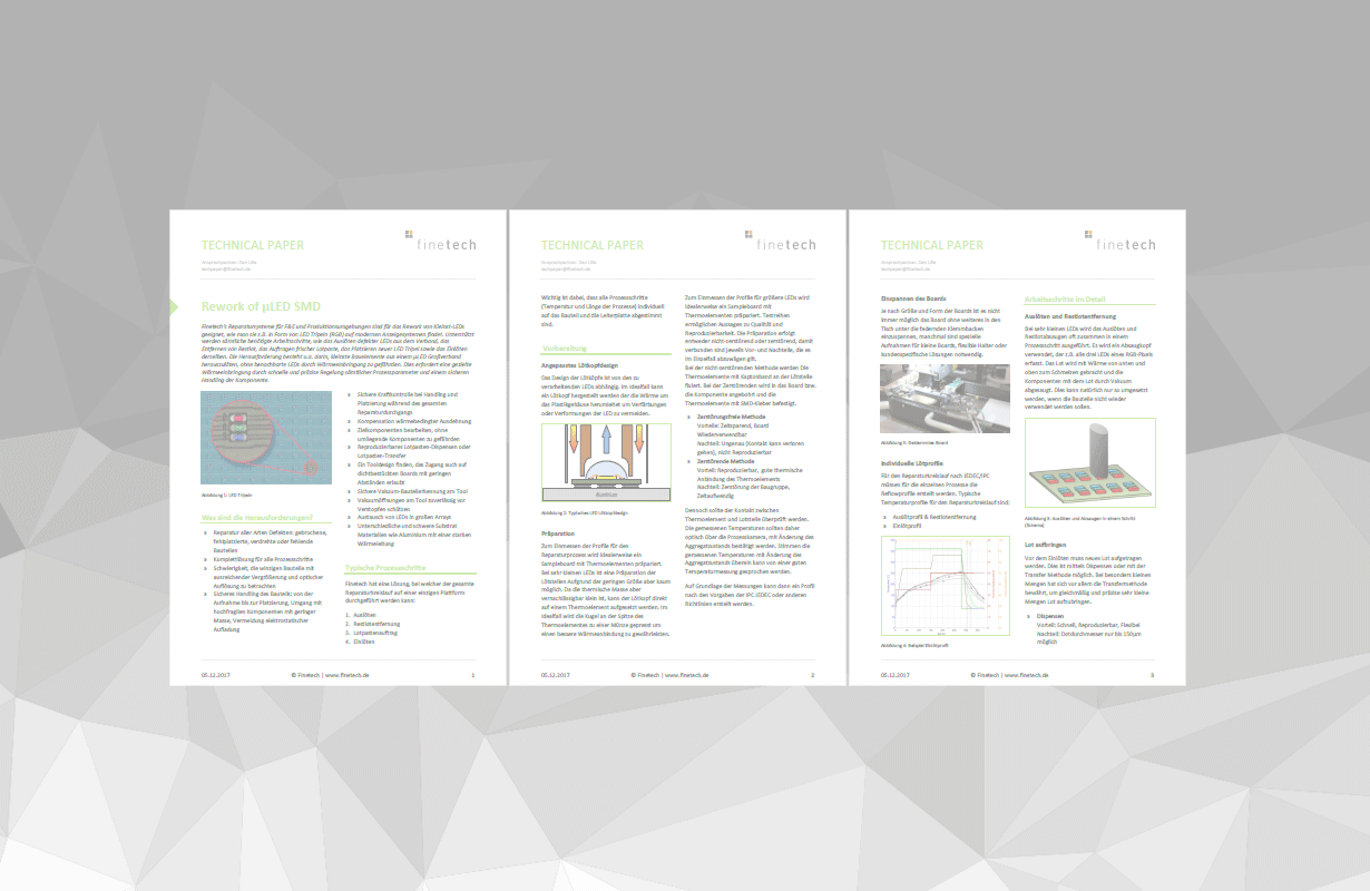 Abstract: Finetech's hot air rework systems for R&D and production environments are suitable for the entire rework cycle of a single or group of miniature LEDs, e.g. in the form of LED triplets (RGB) on modern display systems. All necessary working steps are supported, such as desoldering a defective LED from the panel, removing residual solder, applying fresh solder paste, as well as placing and soldering a new LED onto the panel. The challenge is, beside visibility and placement accuracy, to de-solder smallest components from a mini-LED assembly without damaging nearby LEDs. This requires a targeted heat input through fast and precise control of all process parameters as well as safe component handling.