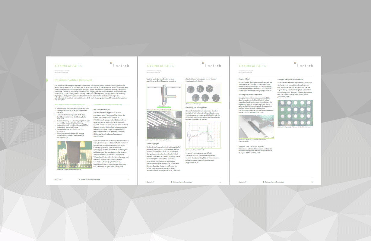 Abstract: An accurate residual solder removal is an essential factor of success for most rework applications. In field, this is often done using solder iron and wick. Unfortunately, the quality of the solder removal strongly depends on the operator's skills. Pads will be frequently torn off or the solder resist will get damaged. When looking ahead it is also evident that component sizes will keep shrinking and packing densities will get higher. This means that proper access to the residual solder will become more of a challenge. This is there Finetech's solutions for contactless residual solder removal comes into play. They are suitable for virtually all SMD components in the market, from small passive resistors to large BGAs.
