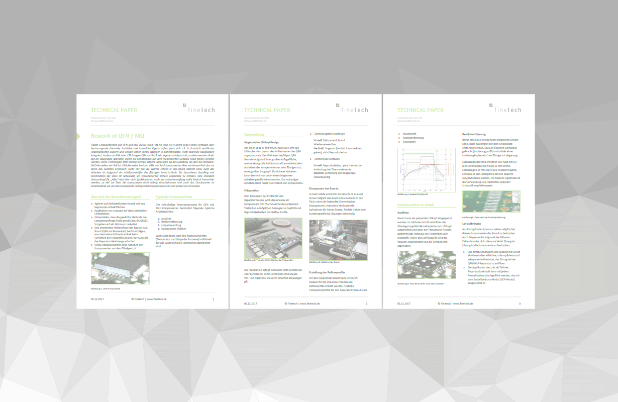 Abstract: Flat packages such as QFNs (Quad Flat No-lead) or other MLFs (Micro Lead Frame) with outstanding thermal, inductive and capacitive characteristics (for example resulting in much shorter reaction times) are being increasingly incorporated into densely populated, space-saving assemblies. However, unlike BGA components, QFNs do not provide a solder ball array for SMD assembly but have to be soldered to the assembly with their contact pads attached directly to the metalized body (lead frames). This technology makes much higher demands compared to the handling of standard SMD components. Usually, QFN and MLF components have a mass pad which is especially hard to de-solder. Not only the heat is quickly dissipated into the board, but also the removal is critical due to adhesion forces of the liquid solder. The nozzle had to be constructed and handled in a certain way to achieve reliable results. Fresh solder paste also should be applied carefully; too much solder does not allow for the proper floating of the component into position.