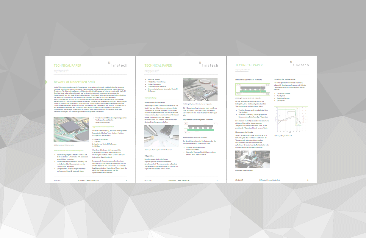 Abstract: Underfilled components are used in consumer electronic products (mobile devices, portable computers etc.), in the automotive industry (sensor modules, engine control units etc.) or whenever flip chips are incorporated in products with maximum miniaturization. An underfilled chip contributes to an improved overall product quality, offering higher reliability and better lifetime. The underfill material provides protection against humidity, thermal stress and all kinds of mechanical impact. Underfill represents a very special challenge for the rework process, because in addition to thermal energy, mechanical energy must be applied in order to separate the chip from the substrate again. Up till now there is no typical “reworkable underfill”, so rework success depends mainly on the materials used, surface properties as well as component and substrate quality. The equipment and tooling used also have a major impact on the general success. Reworking components with rework-able underfill is applicable if the components or substrates are expensive, hard to obtain or if complete products need to be saved.